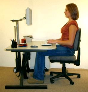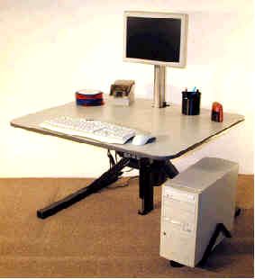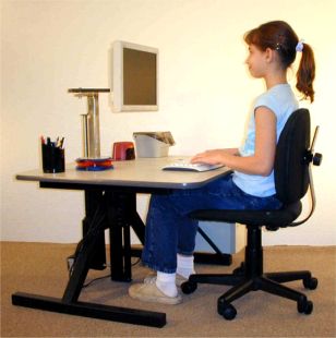 The Infinity Station Ergonomic Workstations The Infinity Station is an electrically actuated adjustable computer workstation. Designed for business, schools, libraries and homes, our unique design was derived from the complex issues of function and cost in making a wheelchair accessible, computer workstation for schools. The Infinity Station is ADA compliant with wheelchair accessibility and low vision applications. Wheelchair users, children and adults can use the same workstation by electrically adjusting the work surface and monitor heights. The Flat Panel Monitor Arm has a wide range of movements, and low vision applications. Infinity Station's electric linear actuators raise and lower the work surface and power our unique monitor lift. The monitor lift raises the monitor above the work surface to the ergonomically recommended eye level position. The Infinity Station provides unprecedented ranges of movement, and adjustability. Our adjustable school computer workstation fits first graders through most adults sitting. Children finally have an adjustable computer desk for school or home that will grow with them. Children no longer have to crane their necks, sit with arms chicken winged and their feet dangling above the floor. Instead of "bending" to fit your workstation, the Infinity Station "bends' to fit your ergonomic needs. We have a particular interest in helping schools furnish computer labs with ergonomically adjustable computer workstations. Please contact us if your school is interested or if you would like to contribute to furnishing ergonomic workstations to computer labs in schools norman@infinitystation.com The Infinity Station ll has sit/stand capabilities with an unprecedented range of adjustment in an ergonomic computer workstation. The Infinity Station school model can fit everyone in a family. Our